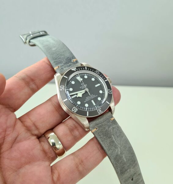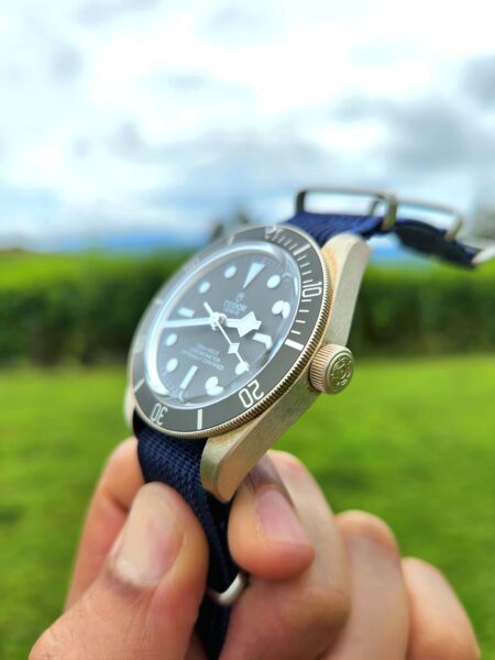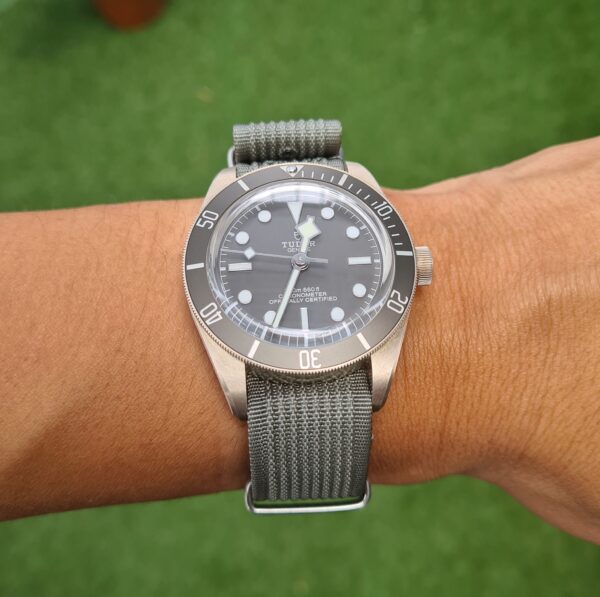 Por otro lado, creo que al igual que el resto de la familia Black Bay, este reloj puede considerarse como un diver todo terreno. Aun así, yo he decidido mantenerlo alejado del agua. Imagino que la pátina hubiese sido más extrema de haber sumergirlo la plata, pero este no era el aspecto que me preocupaba. El principal motivo es que su correa de dotación no es la mejor opción para usarlo en el agua. Pero bueno, con 20 mm entre asas y ese tono “taupe” uniforme, el reloj es un verdadero “strap monster” que se ha prestado para hacer todo tipo de combinaciones, siempre demostrando su gran versatilidad.