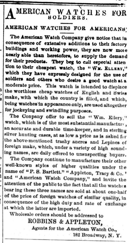 “Se ruega llamar especialmente la atención sobre su reloj más barato, el “Wm Ellery”, que han diseñado expresamente para el uso de los soldados y otras personas que desean un buen reloj a un precio moderado. Este reloj está destinado a desplazar a los relojes baratos sin valor de fabricación inglesa y suiza, de los que el país está lleno, y que siendo relojes sólo en apariencia se utilizan en su totalidad para estafar.”