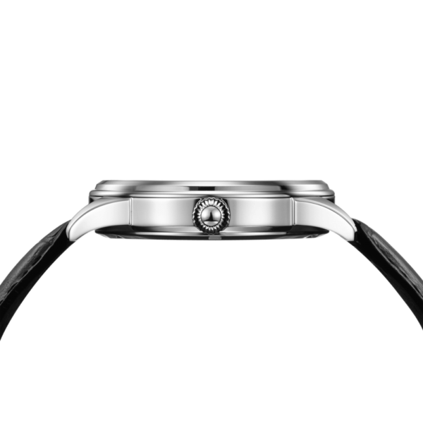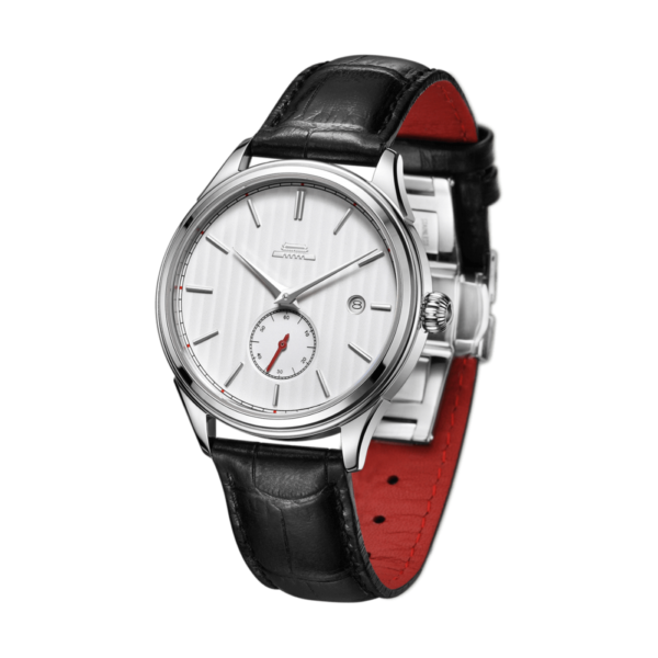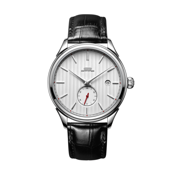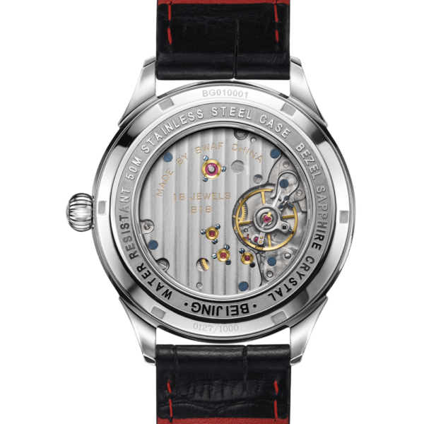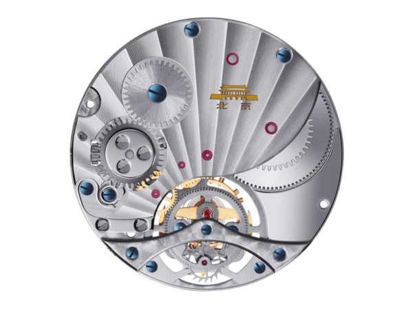 Podemos apreciar que la caja del reloj está realizada en acero. El logotipo de la esfera corresponde a la silueta del palacio de Tiananmén, emblema de la ciudad. El dial lleva inscritas las palabras en chino “China Beijing” y el nombre de marca (que se registró comercialmente) está traducido. Los marcadores (tipo bastón) son aplicados y las agujas responden al tipo “Dauphine”. La trasera es especialmente llamativa, con un pronunciado efecto “soleil” que enmarca el logotipo antiguo de Beijing (el Palacio de Tiananmén) y que también vemos en la esfera.