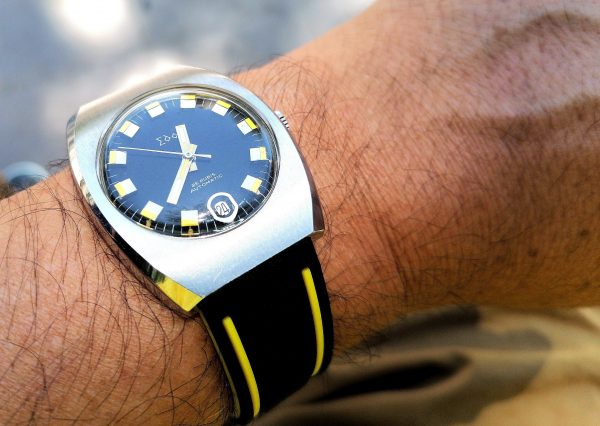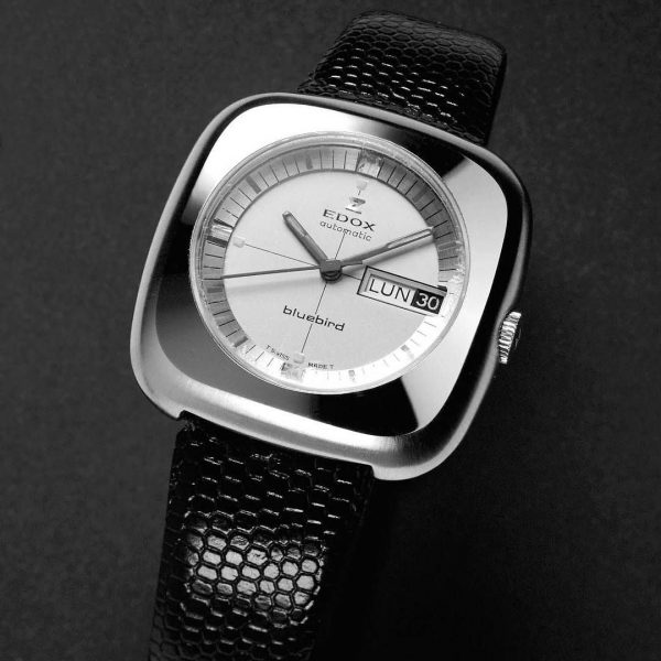 La primera es el Edox “Bluebird” lanzado en 1969. La forma de la caja y la esfera tan bien enmarcada claramente nos recuerdan a nuestro protagonista.