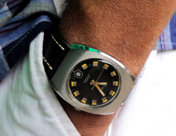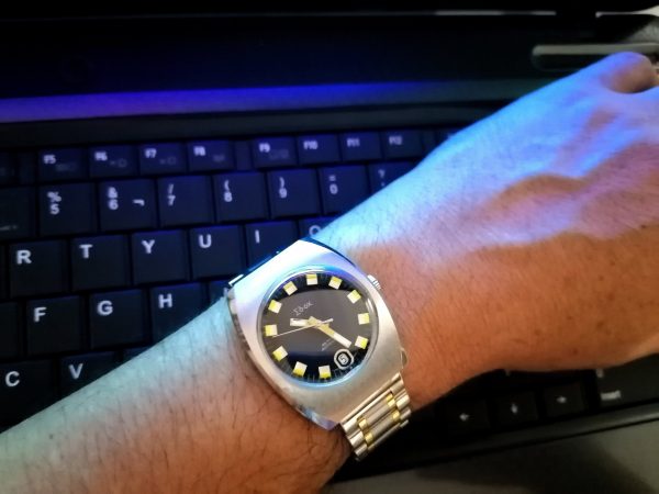 Es un reloj sumamente versátil. Lo he adornado en diversas ocasiones con brazalete metálico, como podéis ver a continuación, o con correas de cuero y hasta de caucho, como se puede apreciar en las otras imágenes de esta entrada. Ofrece un “look” indudablemente retro, pero por el gran estado de conservación del reloj es posible combinarlo con casi cualquier atuendo y no desentona en ninguna situación.