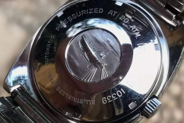 La trasera es roscada y lleva un grabado de un enigmático submarino en un círculo central. Lamentablemente, no he podido obtener más información sobre este detalle. Además, detalla las características principales del reloj. Muestra un número de referencia (“10339”), aunque desafortunadamente no ha servido de mucho para averiguar más información sobre el reloj.