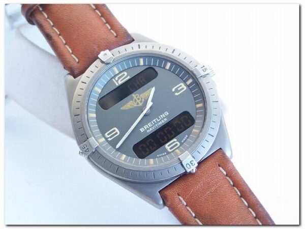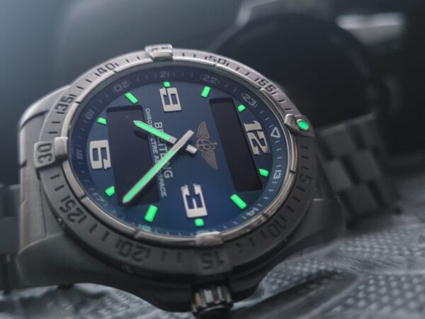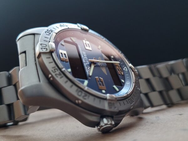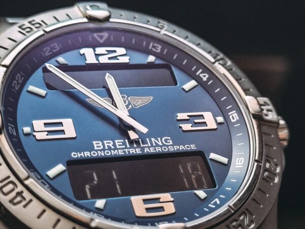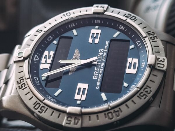 Originalmente, en el momento del lanzamiento, el reloj se llamaba “Navitimer Aerospace”. Sin embargo, a diferencia de su icónico homónimo, el Aerospace fue el primer reloj de piloto de cuarzo que presentó Breitling. La pantalla ana-digi es la quintaesencia de los años 80 cuando surgió este modelo. El Calibre B56 ofrecía el beneficio adicional de una segunda zona horaria digital, una función de cronógrafo y un calendario perpetuo. El reloj, construido en titanio incluso entonces, medía 40 mm de diámetro y tenía un grosor de poco más de 9 mm. Contaba con un bisel giratorio unidireccional y un cristal mineral endurecido. Sin embargo, este primer modelo sólo ofrecía 30 m de resistencia al agua.
