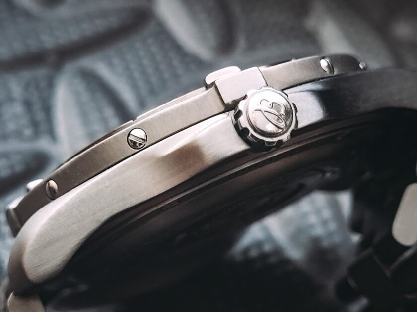 Y, sin embargo, a falta de un término mejor, me atrevería a describir el diseño como muy masculino. Su apariencia predominantemente cepillada (el único pulido es una línea fina y discontinua alrededor del cristal) y su diseño táctico le dan una calidad industrial de herramienta, observable hasta en los tornillos del bisel. La única nota de verdadera superfluidad podría ser su polémico brazalete. Los eslabones en ángulo pueden polarizar a los aficionados de Breitling, pero creo que todo forma parte del encanto de patito feo de este reloj.