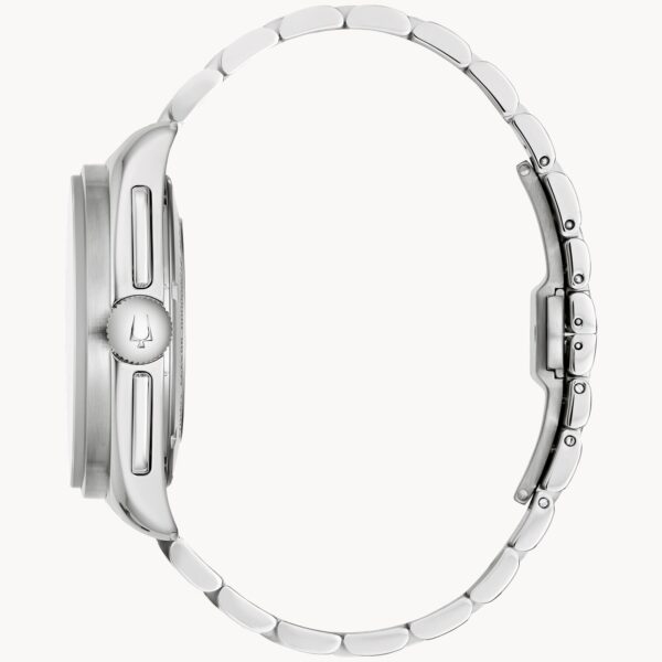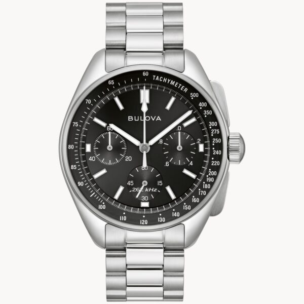 La caja combina laterales pulidos con la parte superior del reloj cepillada, destacando en especial el alto bisel cepillado. Lleva una corona firmada con el logotipo del diapasón de Bulova y conserva los estilizados pulsadores típicos de este cronógrafo.