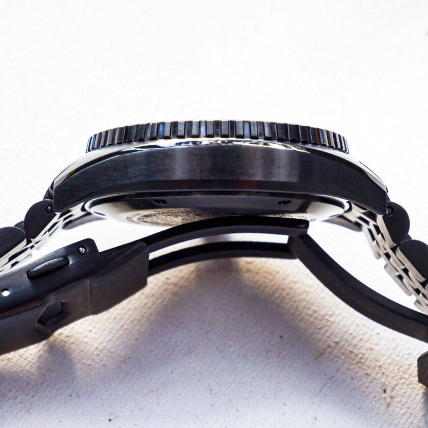 El bisel unidireccional de 120 clicks cuenta con un borde con muescas de gran tamaño, resultando de muy fácil agarre y agradable de actuar. Ofrece un chasquido sonoro y un poco de juego, pero nada remarcable teniendo en cuenta que los relojes reseñados son “prototipos”. Lleva un inserto de aluminio a juego con la elección de color de la esfera y las impresiones de la escala de inmersión son plateadas.