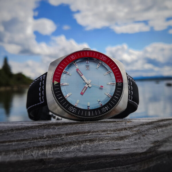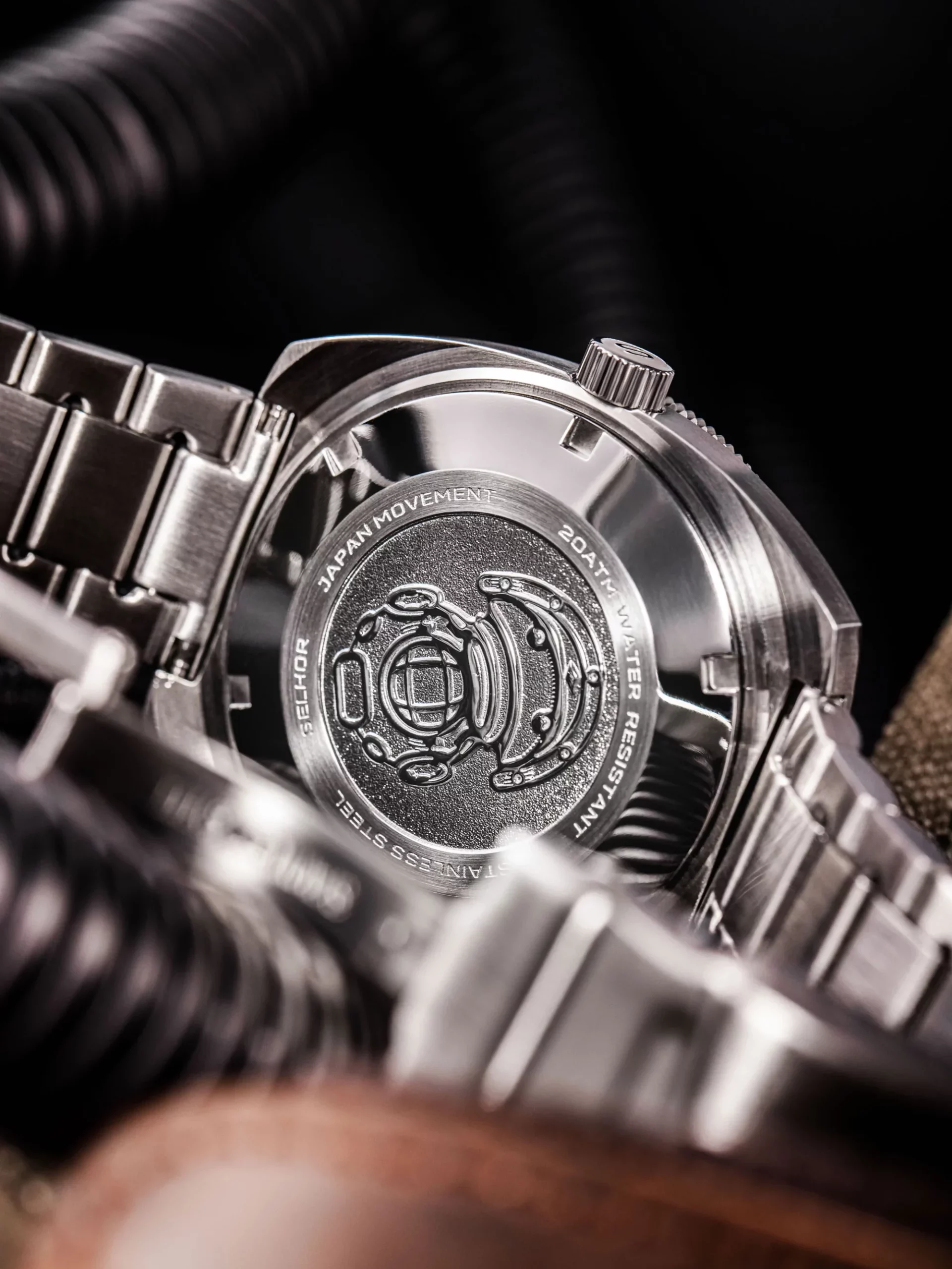 El acabado de la caja es completamente cepillado, como corresponde a un verdadero reloj “herramienta”. El único detalle pulido que es el logotipo en la corona roscada. Al igual que otros relojes de buceo de inspiración vintage, la trasera, también roscada, presenta un hermoso grabado con un casco de buzo.