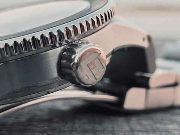 El nuevo bisel más ancho se extiende más allá de la caja, también protegiendo parcialmente la gran corona atornillada en ausencia de protectores de corona. Con la adición de su fondo de caja roscado, el Retrospect III tiene una resistencia al agua de 200 m.
