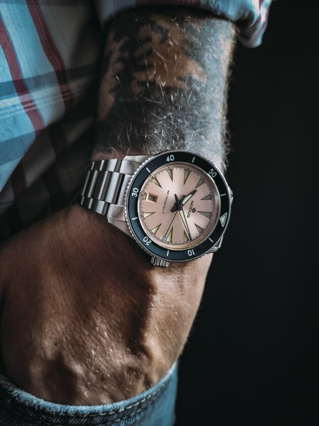 Con su caja predominantemente cepillada, sus 200 m de resistencia al agua, sus asas perforadas y sus pasadores de liberación rápida, el Retrospect III (sobre el papel) parece un reloj “herramienta” por excelencia. Y en cierto sentido lo es. Pero, también trasciende esa categorización. Al igual que aquellos primeros “skin divers” extravagantes de los años 50 y 60, el Retrospect desprende un toque de clase. Es una especie de diver para caballeros. El tipo de reloj que se puede llevar a bucear por la tarde y dejarlo puesto para ir a tomar una copa por la noche. Las variaciones cromáticas cubren una amplia gama, desde las sofisticadas esferas azules y grises fumé hasta la juguetona gama de salmón y naranja ¡Y qué brazalete! El suave ahusamiento de los eslabones en H cepillados, desde los 22 mm en las asas hasta unos esbeltos 18 mm en el cierre, es simplemente perfecto. Y luego está el cierre. Sólido. Fresado y diseñado de forma experta para expandirse a lo largo del día a medida que la muñeca se hincha, o quizás para ajustarse perfectamente sobre el guante de buceo. Se trata de un reloj en lenta evolución, que mantiene lo que lo hizo popular al principio, pero que se transforma imperceptiblemente en lo que siempre debió ser.