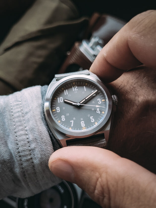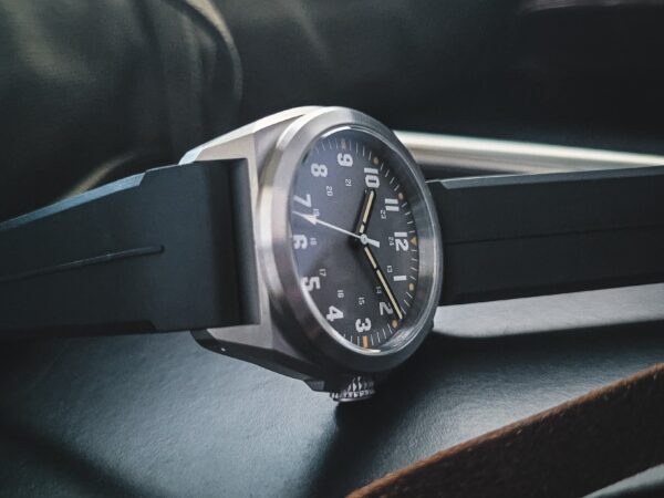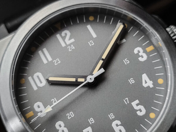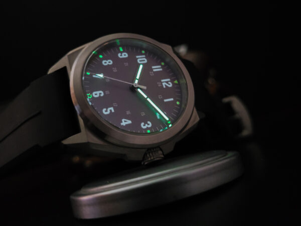 Como todos los relojes de la marca, el titanio utilizado aquí está tratado con un revestimiento ULTRAHex patentado que protege el reloj de la oxidación y los arañazos. El nuevo diseño de la caja es muy atractivo y combina planos cepillados con chaflanes y biseles pulidos. Aunque mantiene el aspecto angular general de los modelos anteriores, los lados de la caja tienen una forma diferente, que recuerda a otros grandes relojes de campaña como el CWC Mellor 72 o incluso el Hamilton Aviation Pilot Pioneer.