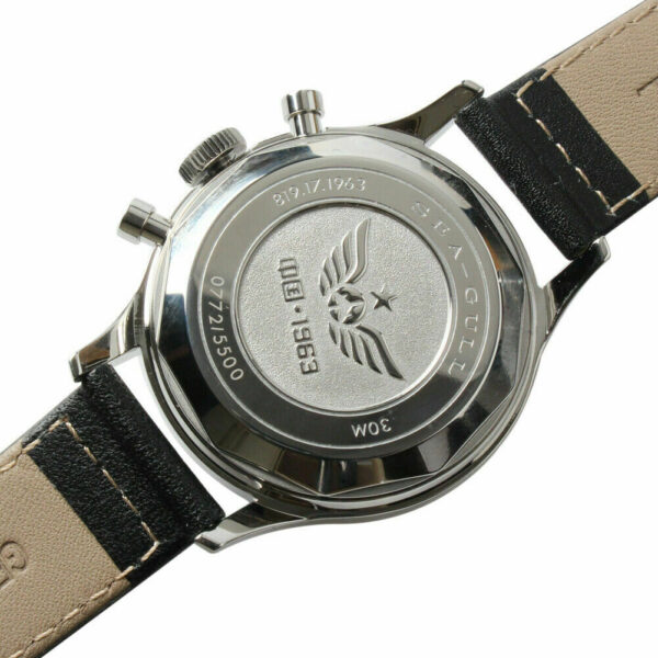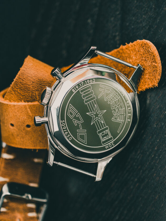 Esta versión sólo tiene 13 mm de alto, lo que viene a ser 1 mm menos que la versión ordinaria, al prescindir de la trasera vista. El fondo ciego roscado que lleva viene grabado con un motivo conmemorativo. Añade el nombre se la marca (“SEA-GULL”), el número de serie del reloj (509/650 en este caso), la referencia (819.17.1962) y la resistencia al agua de 30 m.