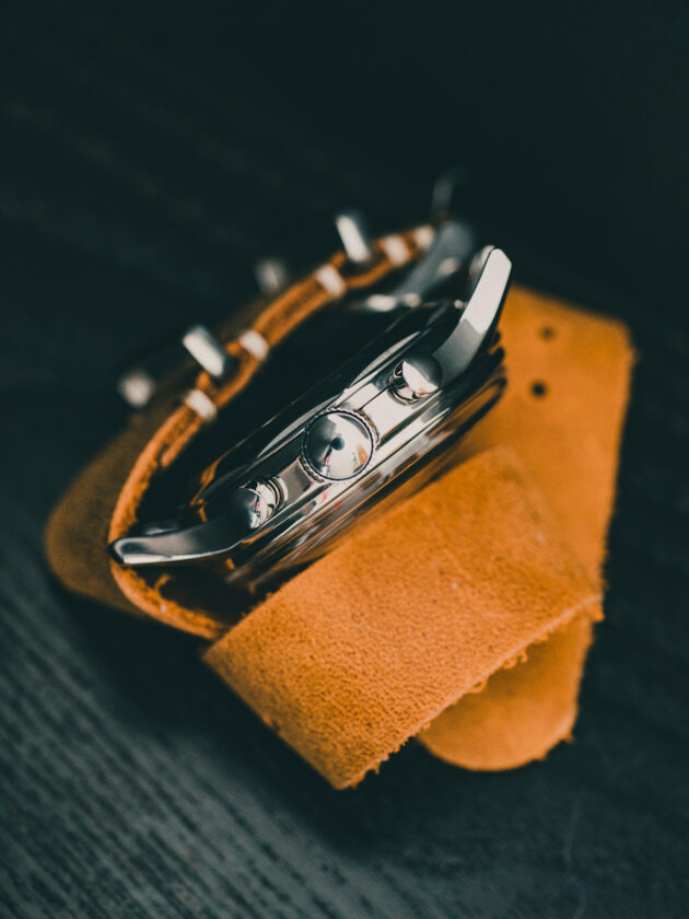 De perfil vemos que la corona tiene un acabado acanalado y no lleva firma, como debe de ser en las versiones “genuinas”. Muchas reinterpretaciones añaden una firma en la corona que nunca existió en los relojes originales. Los pulsadores son del tipo hongo con una disposición radial. La vista lateral también muestra las asas inclinadas hacia abajo para abrazar mejor la muñeca.