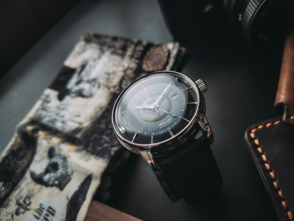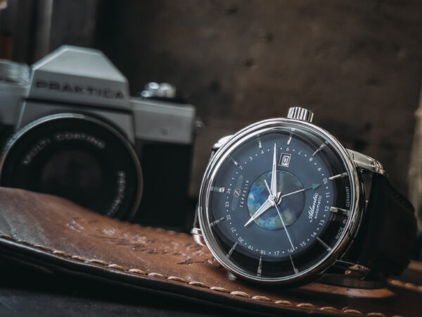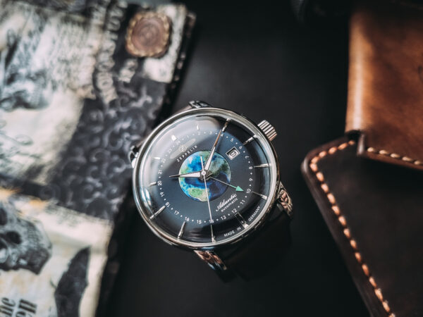 Envuelto en una preciosa cúpula de cristal, el Zeppelin Atlantic Automatic GMT es un reloj llamativo. Casi puede uno perderse en el azul medianoche de su esfera, y los detalles pulidos en todo el reloj atraen la luz. Sin embargo, su disco central esmaltado, con una colorida representación del Atlántico, no deja de ser una novedad. En conjunto, me recuerda a una brújula de aviación, con su aguja dauphine y sus múltiples índices.