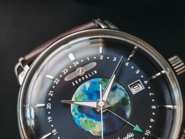 De partida, llama la atención la novedad en el centro de la esfera: un disco esmaltado con una representación realista de la Tierra. Aunque no estaba seguro de lo que me parecería cuando abrí la caja por primera vez, después de pasar varias semanas con el Atlantic GMT puedo afirmar que el semi globo (que destaca el hemisferio norte) me parece encantador. Tiene algo de la época clásica de la exploración. El resto de la esfera tiene los rasgos familiares de un Flieger, pero presentados de forma ligeramente elevada. Su estilizado logotipo Art Déco recuerda mucho a la edad de oro del zepelín. Los índices de las horas en cuña, pulidos y biselados, son un añadido de clase que decora el borde exterior de la esfera. El contador de 24 horas impreso en la esfera interior es sobrio y sin pretensiones.