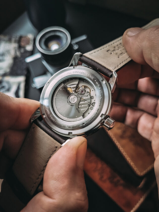 En el lado opuesto, encontramos un fondo de caja de exposición roscado, dejando al descubierto la estrella del espectáculo: el Miyota 9075 de Citizen. Estéticamente, no hay mucho que destaque del calibre. Por ejemplo, el rotor no está decorado. Pero el Miyota que presentamos aquí es la respuesta de Citizen al NH34 de Seiko, que inició la batalla de los GMT asequibles a principios del año pasado. Sin embargo, la sorpresa viene por su funcionalidad. El Miyota, a diferencia de su competidor, tiene una aguja horaria saltante, convirtiéndolo en un “True GMT”.