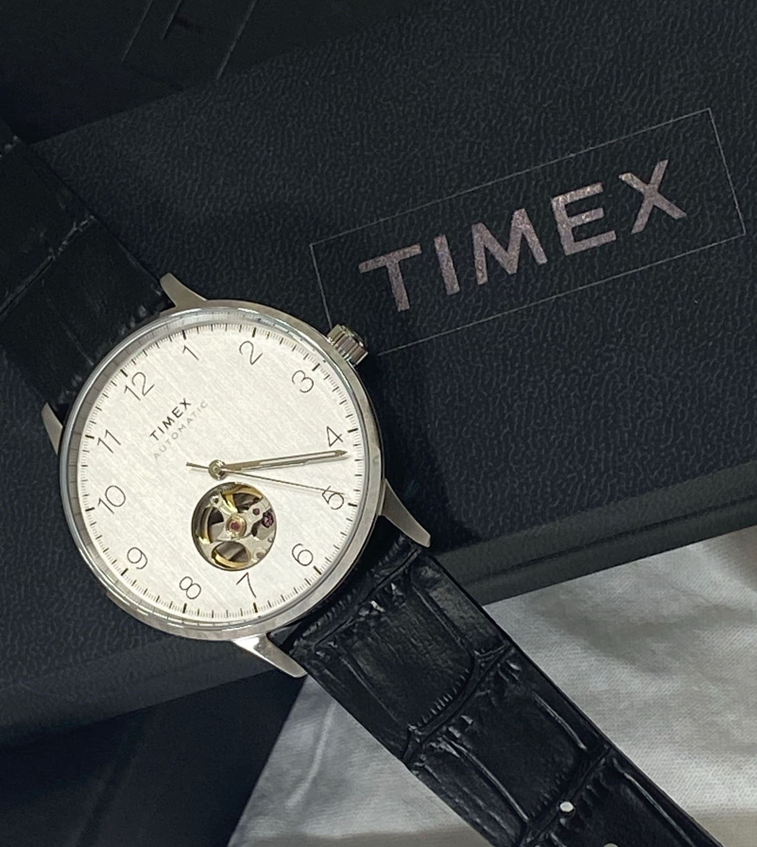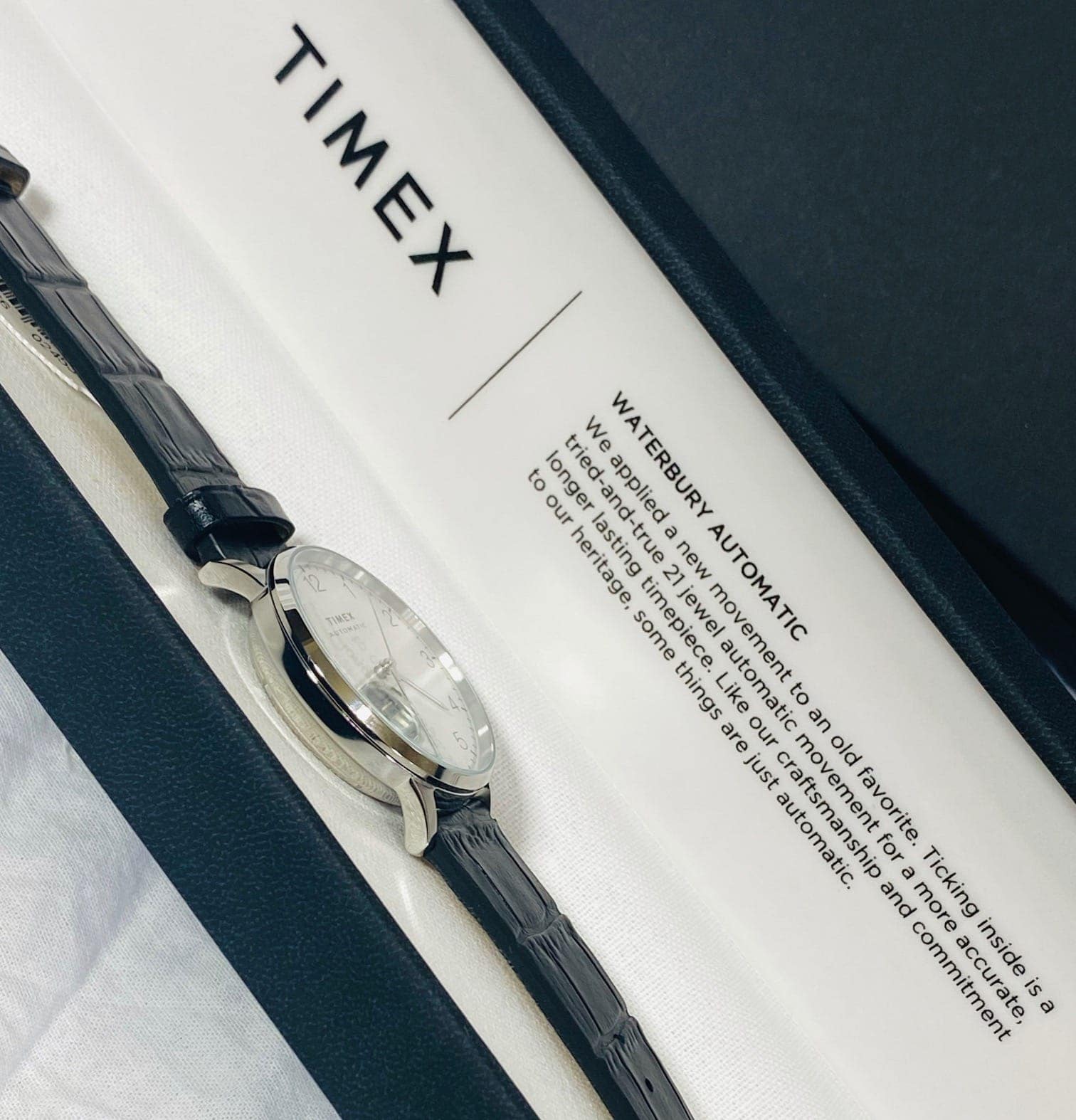 La caja del reloj viene protegida por un cobertor externo estándar de cartón blanco, seguido de una caja de negro esmoquin con el logotipo de Timex en relieve. La caja del reloj también es negra, a juego con la exterior. Está forrada de lino por dentro. Impreso fuera de la caja vemos en un color gris/plata la marca “Timex” dentro de un rectángulo y ya dentro de la caja, en el interior de la tapa, vemos otro “Timex” impreso así como una inscripción que resalta el “nuevo movimiento automático de Timex”, para emocionarnos… De todos modos, es un empaquetado muy impresionante dado el precio del Timex Waterbury Classic. Me hizo sentir que estaba a punto de presentar un buen reloj suizo.