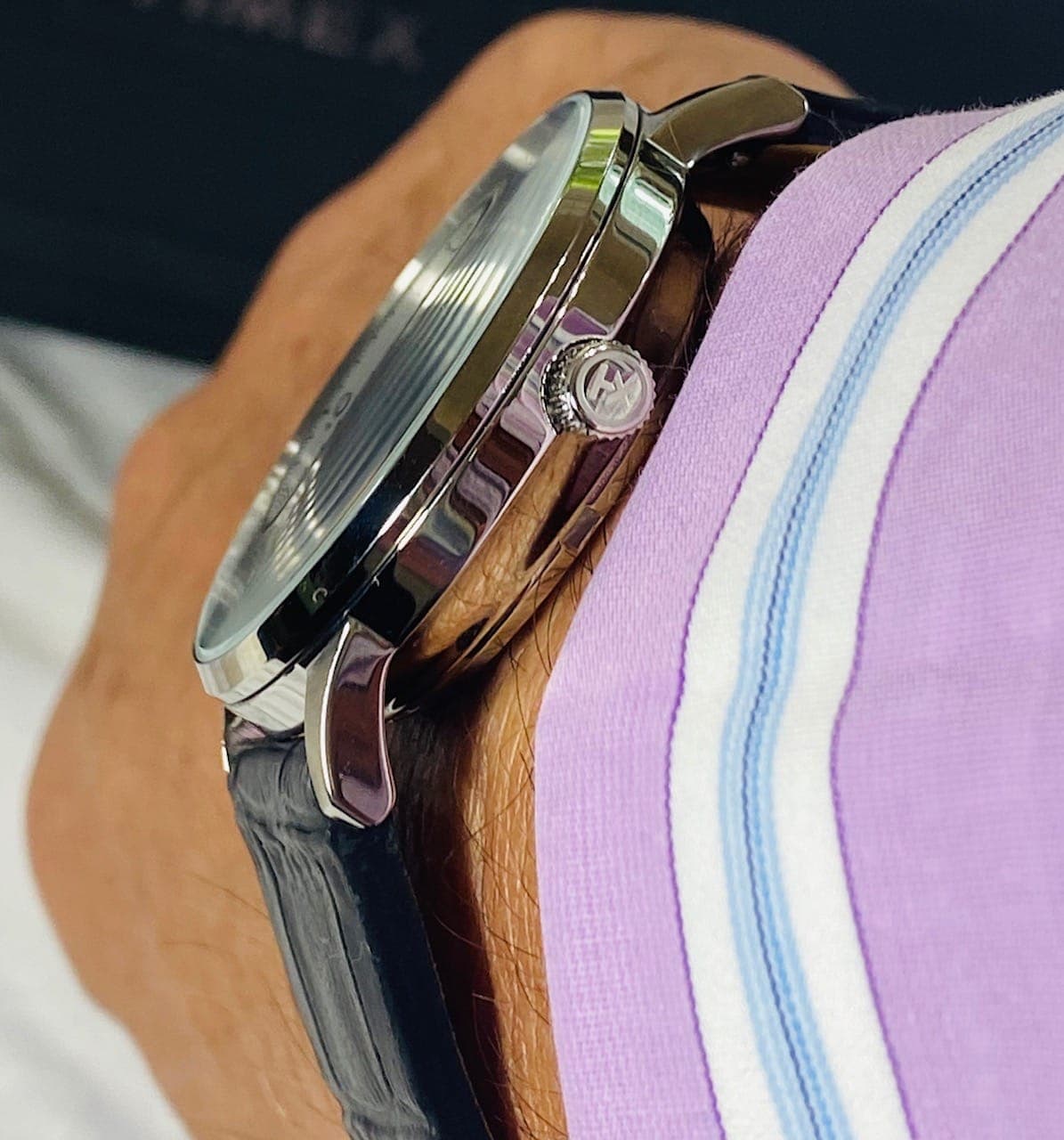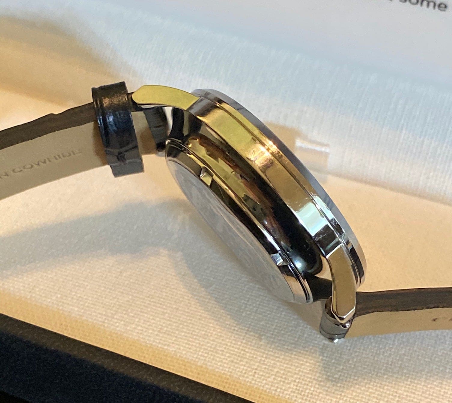 Simple y llanamente, la correa es una mera tira de piel de vaca negra hecha en la India con un estampado exótico. Sin embargo, es bonita y la inclusión de pasadores de liberación rápida es un gran detalle. La verdad, es una correa decente dado el precio de la pieza. Una correa negra, satinada y acolchada con costuras en contraste también funcionaría bien en este caso. La hebilla tiene un acabado cepillado mate y debería haber sido pulida para que coincidiera con el acabado de la caja del reloj. Después de todo, es un reloj de vestir, ¿no?